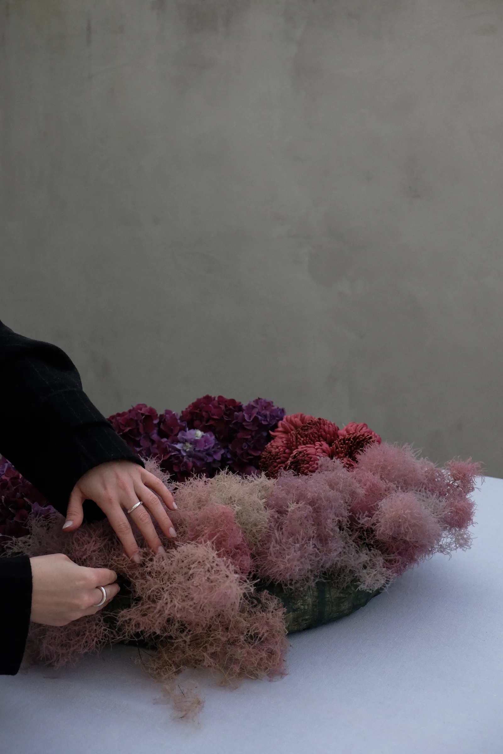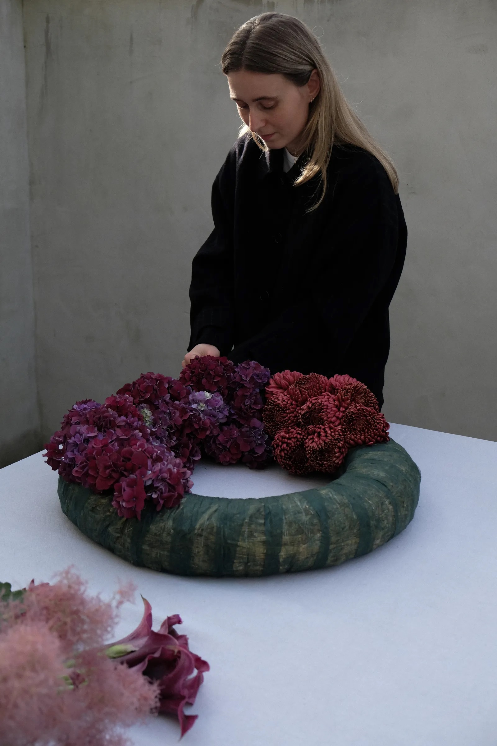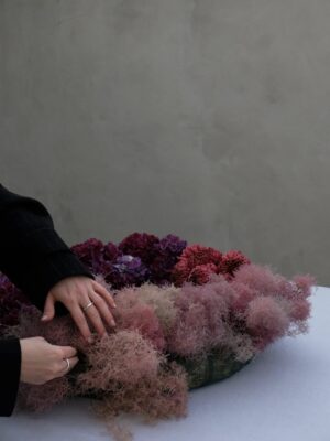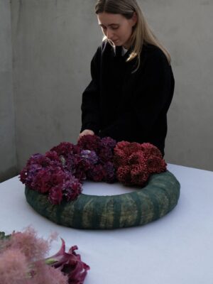 Okrugla spužva koja se može iznova i iznova namakati idealna je za ovaj angažman sa svježim cvijećem, preporučuje stilistica Marie Ganghofner koja je, kako kaže, s ovim vijencem htjela sam stvoriti raznolikost i dimenziju korištenjem različitih oblika i visina cvijeća. Hortenzije dominiraju, dok krizanteme daju aranžmanu finu strukturu. Ukrasni grm Cotinus coggygria, s druge strane, sprječava da vijenac postane previše kompaktan, jer ima teksturu oblaka. Kale se, pak, mogu koristiti za tvaranje asimetrija.