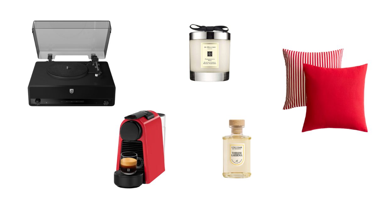 Philips gramofon, Elipso; Jo Malone mirisna svijeća, Douglas; Ukrasni jastučići, H&M Home; Difuzor za dom Tubéreuse Gardénia, L’Occitane; Aparat za kavu, Nespresso