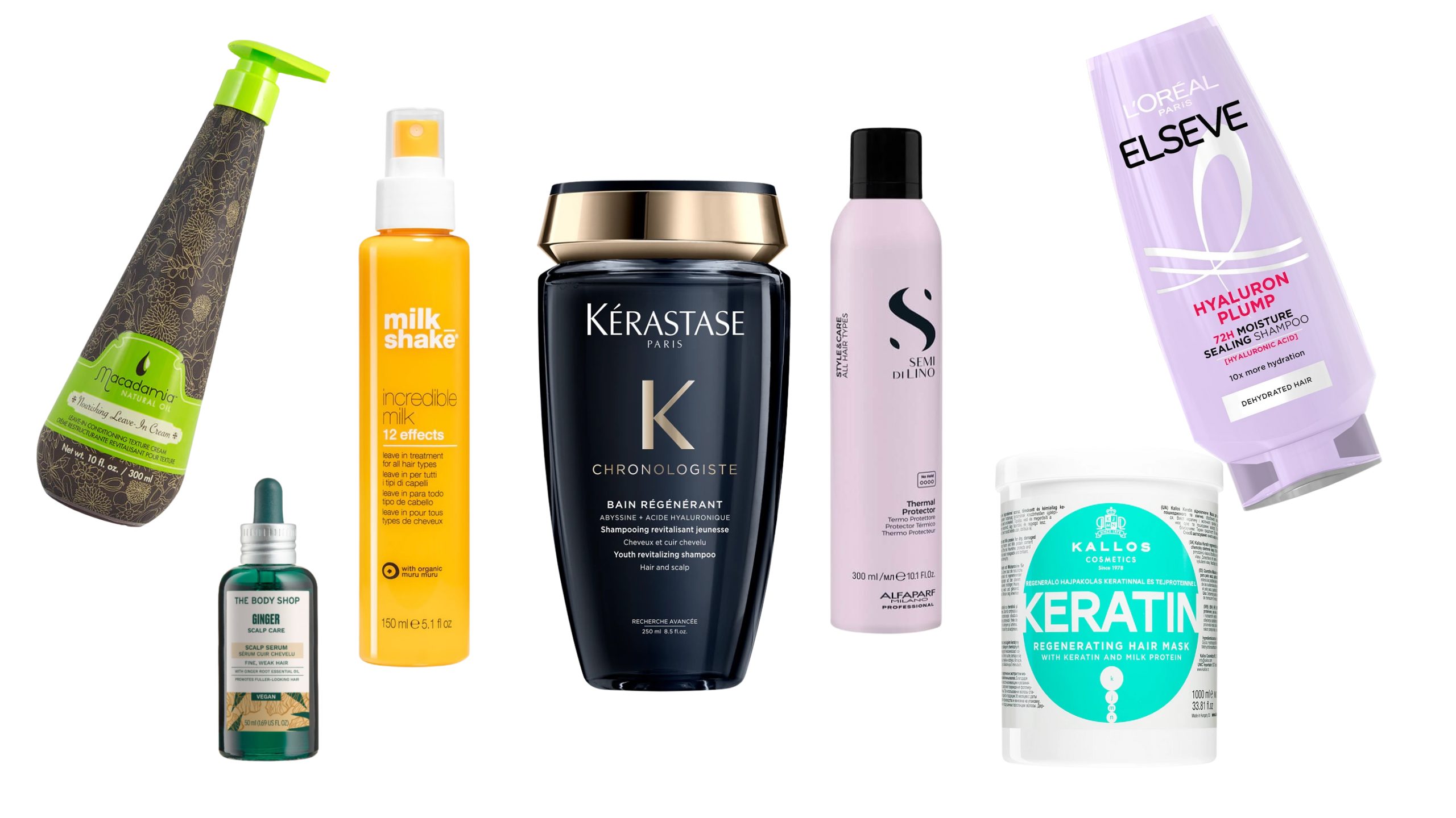 Macadamia Natural Oil Nourishing Leave In Cream Regenerator u kremi, Douglas parfumerija; Ginger Scalp Serum, The Body Shop; Milk shake njega bez ispiranja za sve tipove kose, Notino; Kerastase, Notino; Alfaparf Milano Thermal & Stayling Protector sprej za zaštitu od topline, Douglas parfumerija; Kallos maska za kosu s keratinom, Notino; regenerator za dehidriranu kosu, L’Oreal, dm