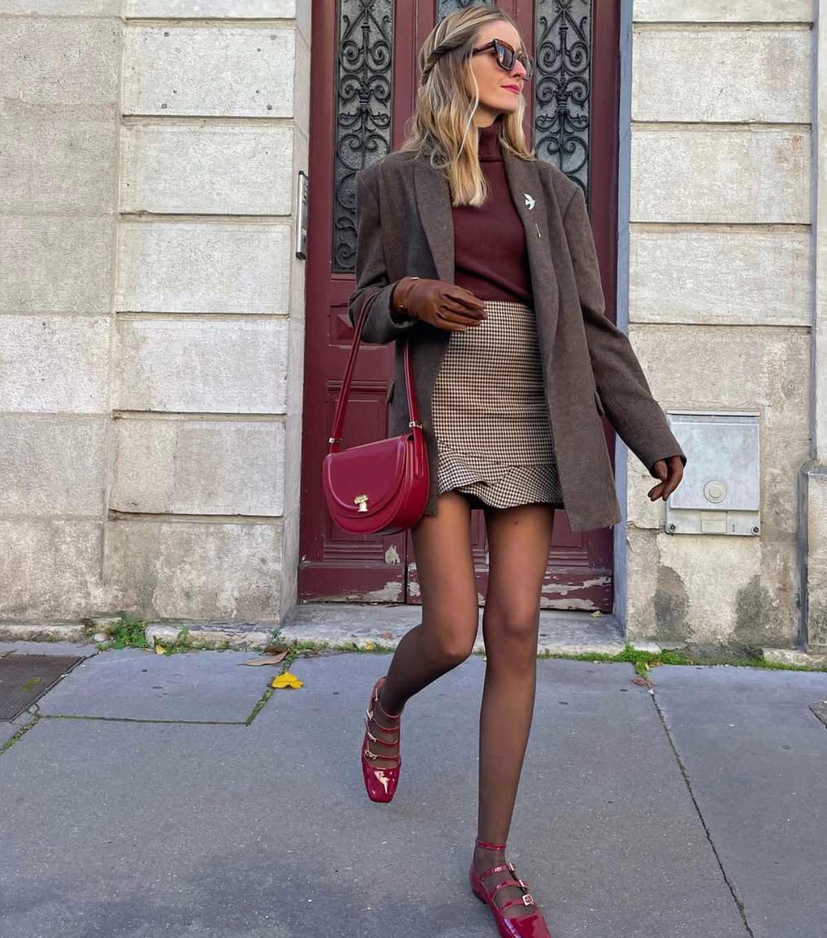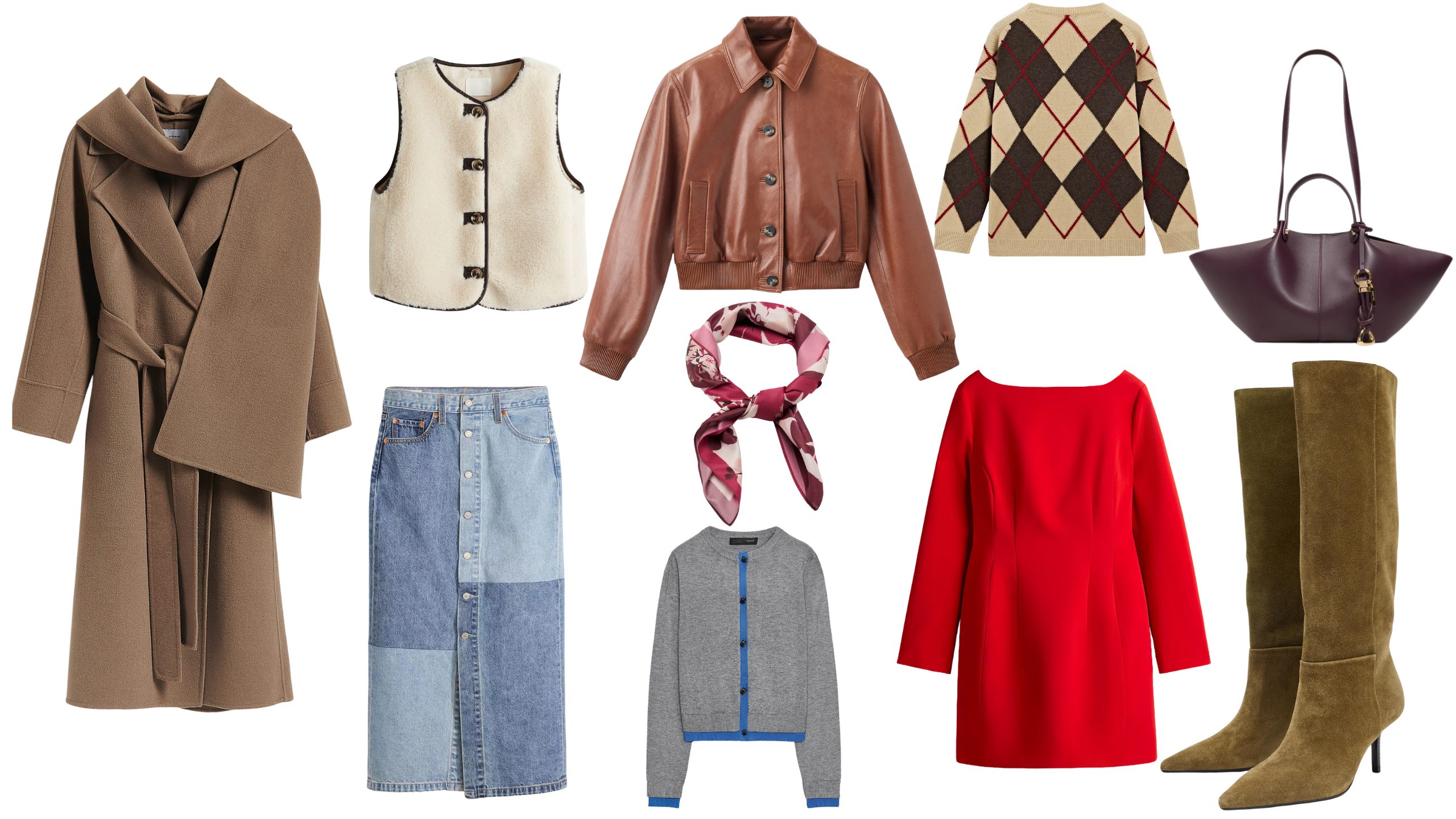 Kaput: Reserved; prsluk: H&M; denim suknja: Europa 92; kožna bomber jakna: Mango; marama: Mango; vesta: Zara; đžemper: Massimo Dutti; crvena haljina: H&M; torba: Aldo: čizme: Zara
