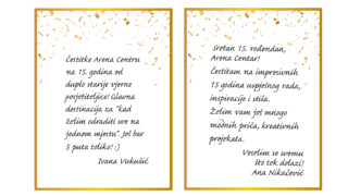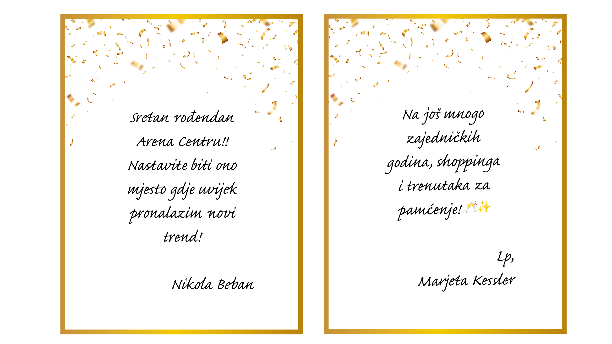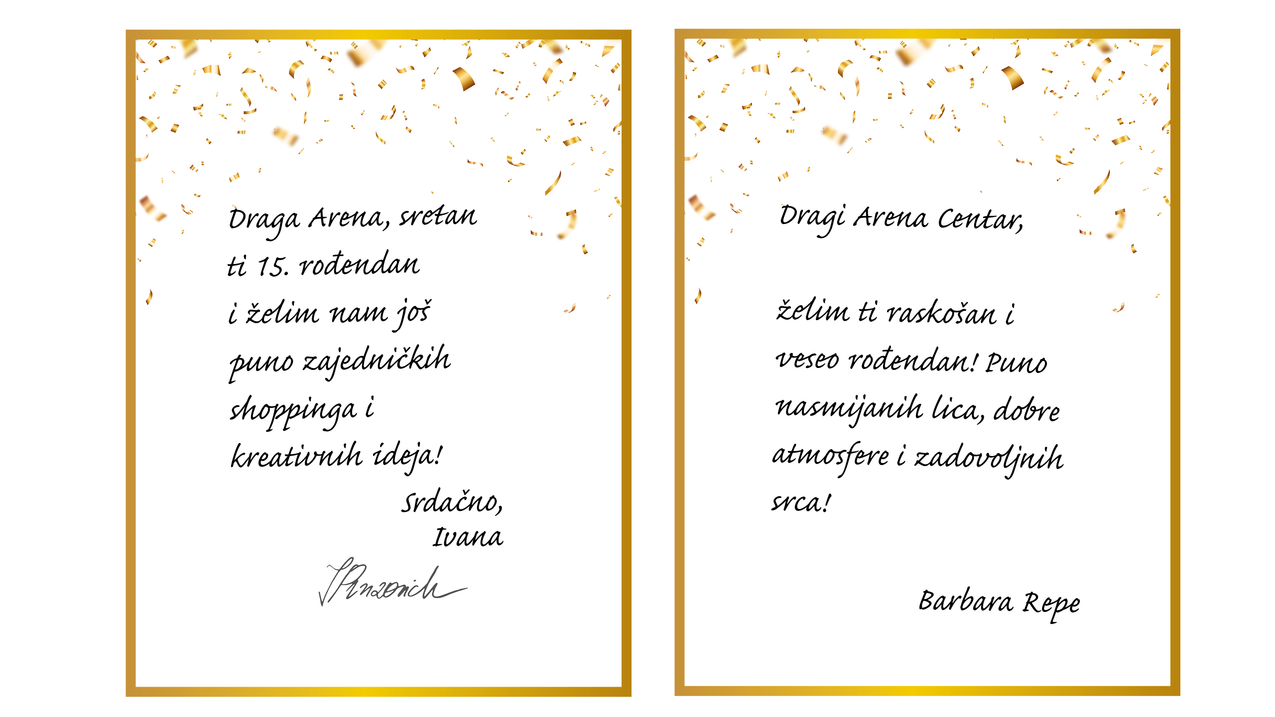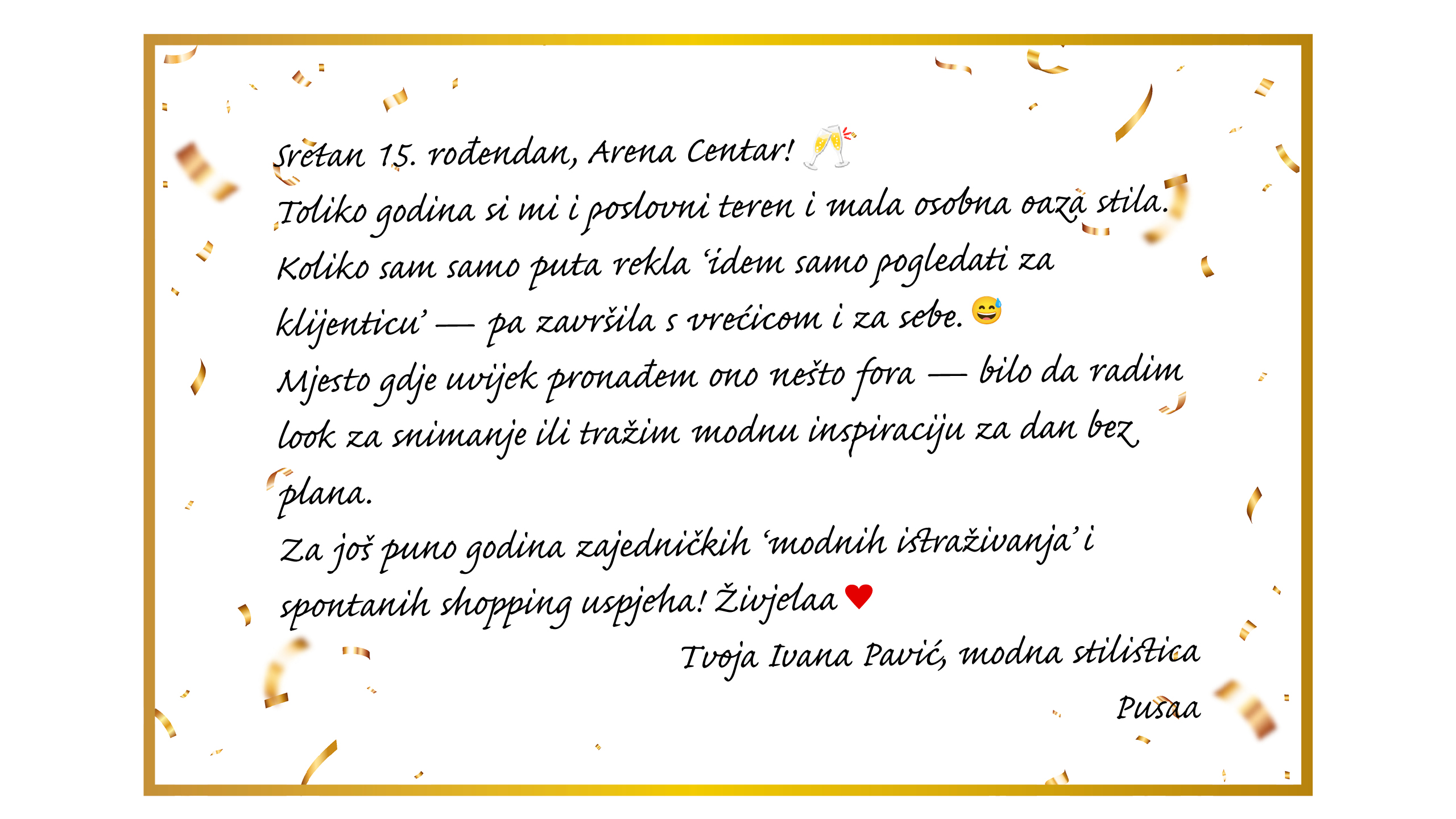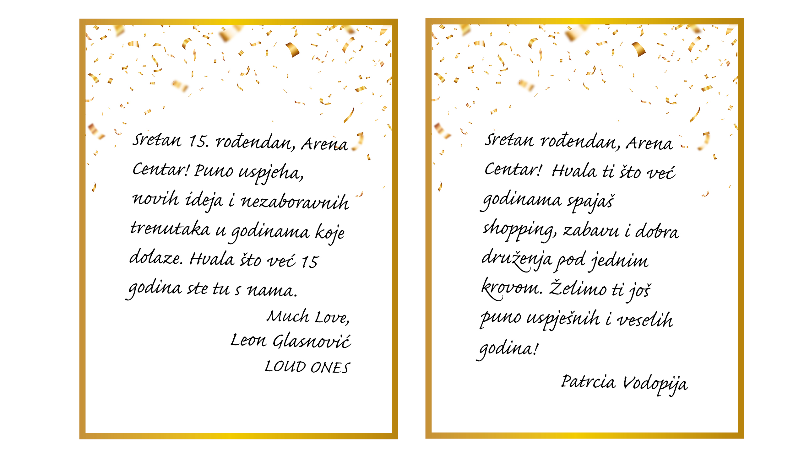 I naravno, sudjelujte u nagradnom natječaju: napišite i vi rođendansku poruku Arena Centru. Najkreativnijih 15 osvaja poklon karticu od 500 €