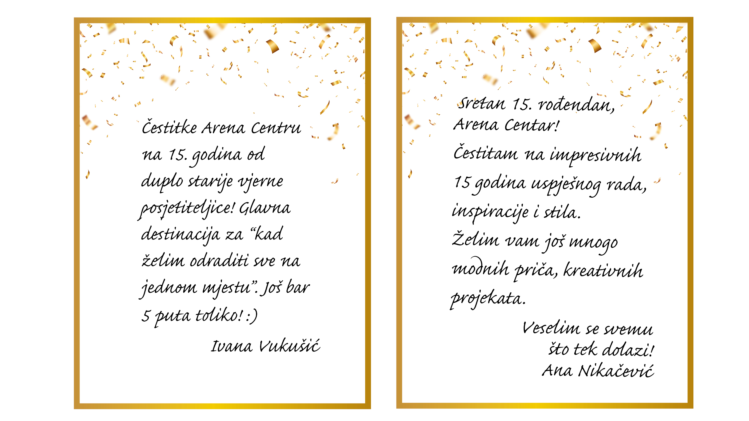 Svi smo pozvani na veliku rođendansku proslavu! Tijekom ovih petnaest godina Arena Centar ugostio je najjače svjetske brendove, organizirao fantastične modne revije, koncerte i stvorio trenutke koji su obilježili cijelu jednu eru kupovine. Sad je vrijeme da zajedno proslavimo prošle uspomene i poželimo nove.