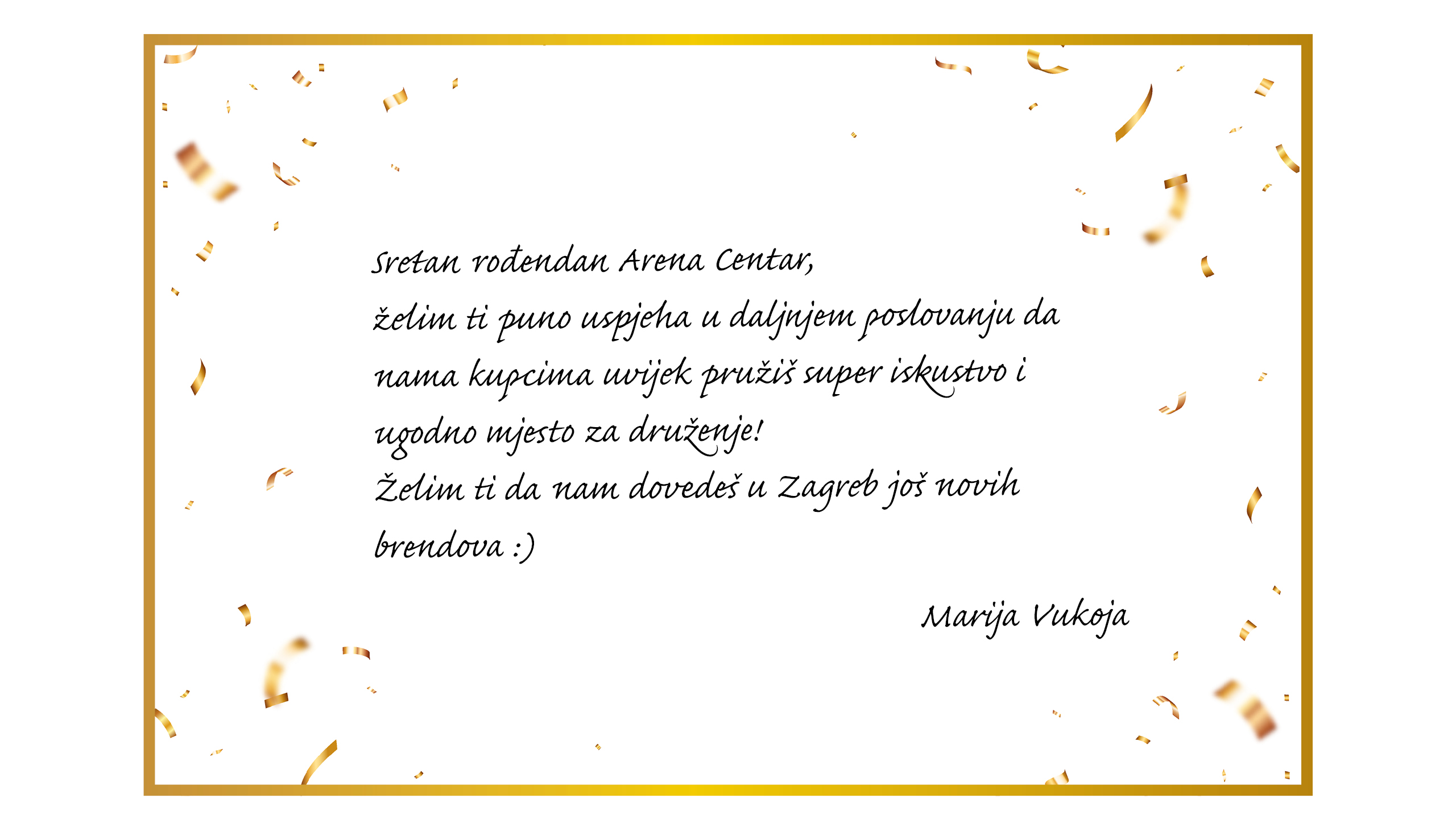 Ne propustite ni vi napisati rođendansku čestitku Arena Centru. Budite kreativni, originalni i iskreni jer 15 najkreativnijih osvaja poklon karticu Arena Centra od 500€