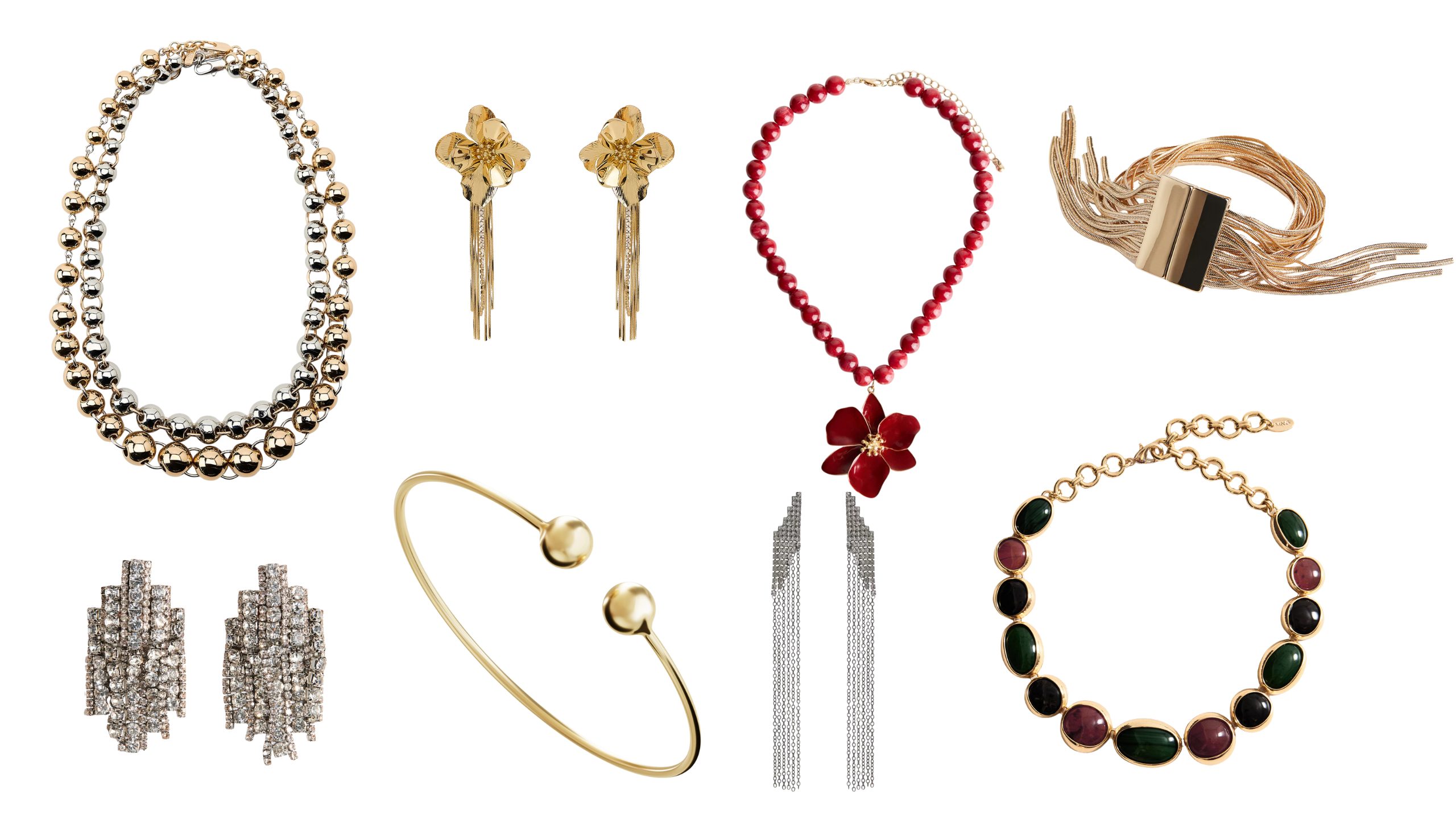 Dvije kombinirane ogrlice s kuglicama: Zara; naušnice: H&M; duge pozlaćene naušnice: Reserved; srebrna narukvica s pozlatom: Argentum; crvena ogrlica: Bershka; duge naušnice: Pull&Bear; pozlaćena narukvica: H&M; ogrlica s kombiniranim perlama od smole: Mango