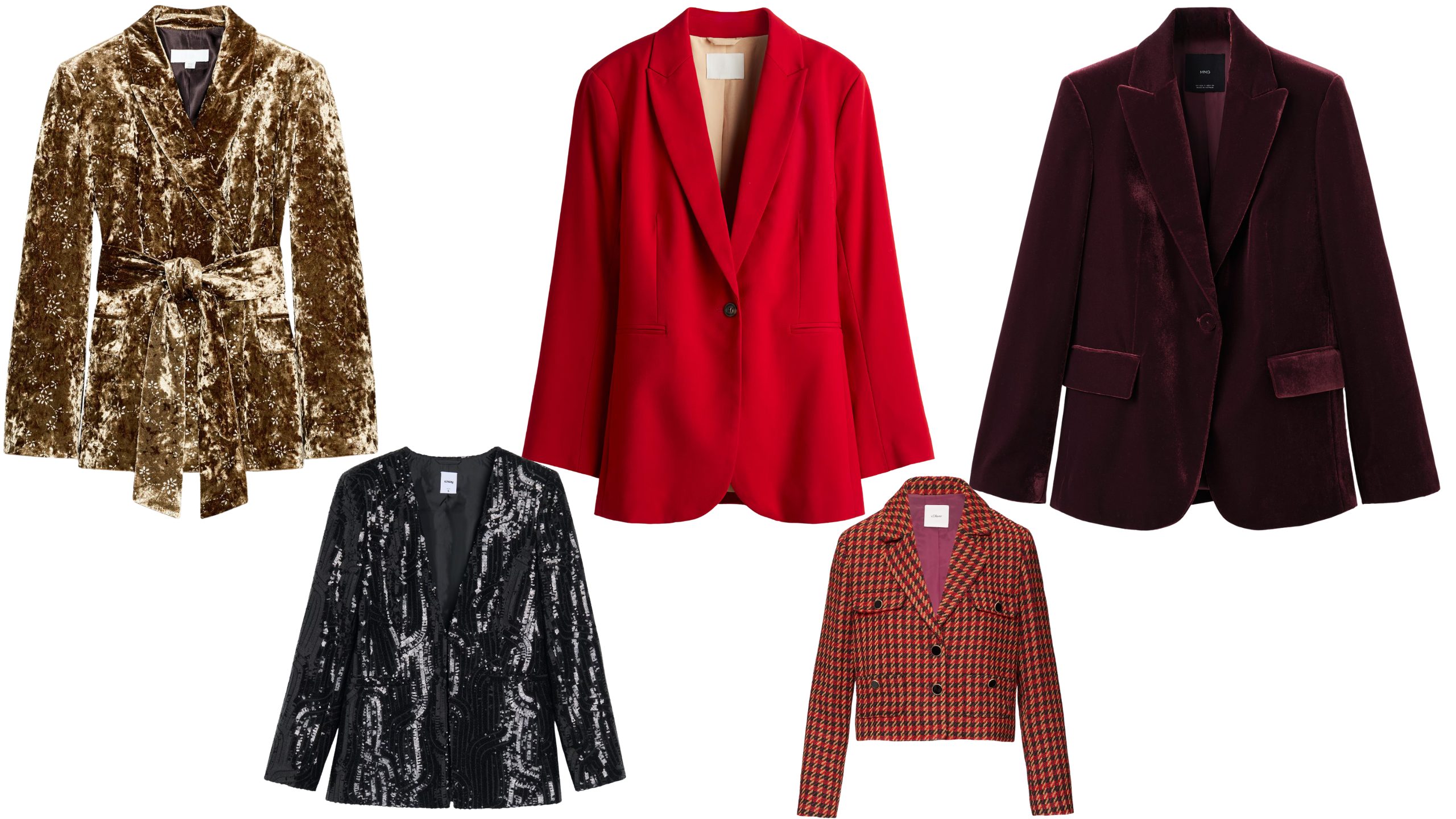 Baršunasti sako s remenom i metaliziranim nitima: Zara; sako sa šljokicama: Sinsay; crveni sako: H&M; sako kariranog uzorka: s.Oliver; baršunasti sako: Mango