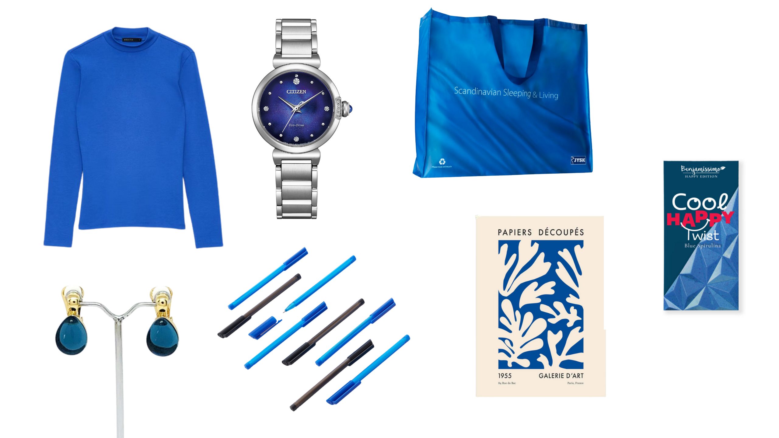 U smjeru kazaljke na satu: Naušnice Kamena duga; Majica Mohito; Citizen sat, Dicta; Shopping torba Jysk; Čokolada Blue Spirulina, bio&bio; Poster H&M Home; Flomasteri Pepco